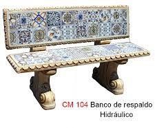 Decorativo banco de jardín fabricado en piedra artificial con acabado en pátina ocre y azulejos imitación hidráulico. Apto para interior y exterior.