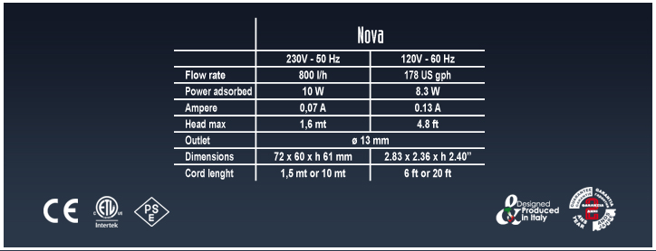 Bomba sumergible para fuente, estanque, acuario Mod. nova, con un caudal de agua de 800 l/h y una elevación máxima del agua de 1,6 m. En la parte frontal dispone de un regulador que permite variar el caudal de agua. Cable 1,5 m.