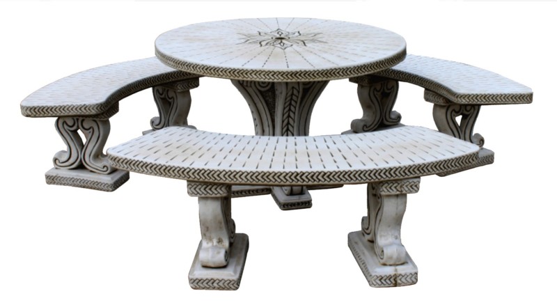 Comedor de jardín fabricaddo en piedra artificial, resistente a los elementos climáticos, compuesto por una mesa circular de 116 cm. y tres bancos curvos. Disponible con acabado en pátina ceniza, ocre y siena.