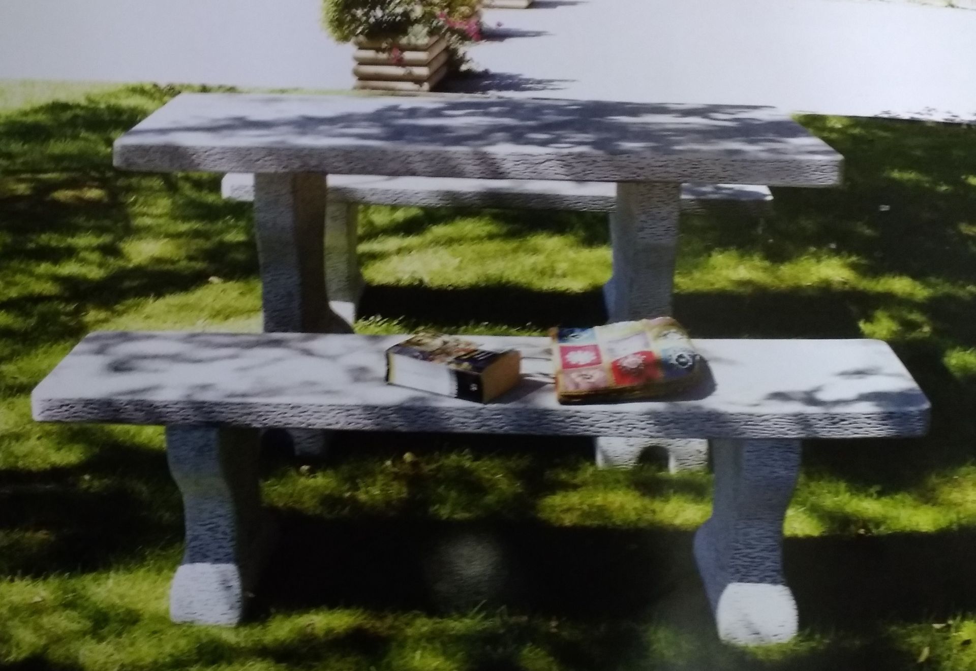 Decorativo comedor de jardín modelo Natural compuesto por una mesa rectangular y dos bancos rectos, fabricado en piedra artificial resistente a los elementos climáticos. Disponible con acabado en color marrón claro y gris.