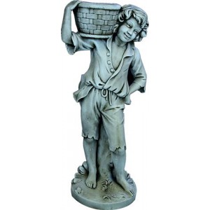 Bonita figura niño con cesta para maceta, fabricada en piedra artificial resistente a los elementos climáticos, disponible con acabado en pátina ceniza, ocre y siena.