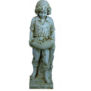 Bonita figura niño con cesta de gatitos, fabricada en piedra artificial resistente a los elementos climáticos, disponible con acabado en pátina ceniza, ocre y siena.