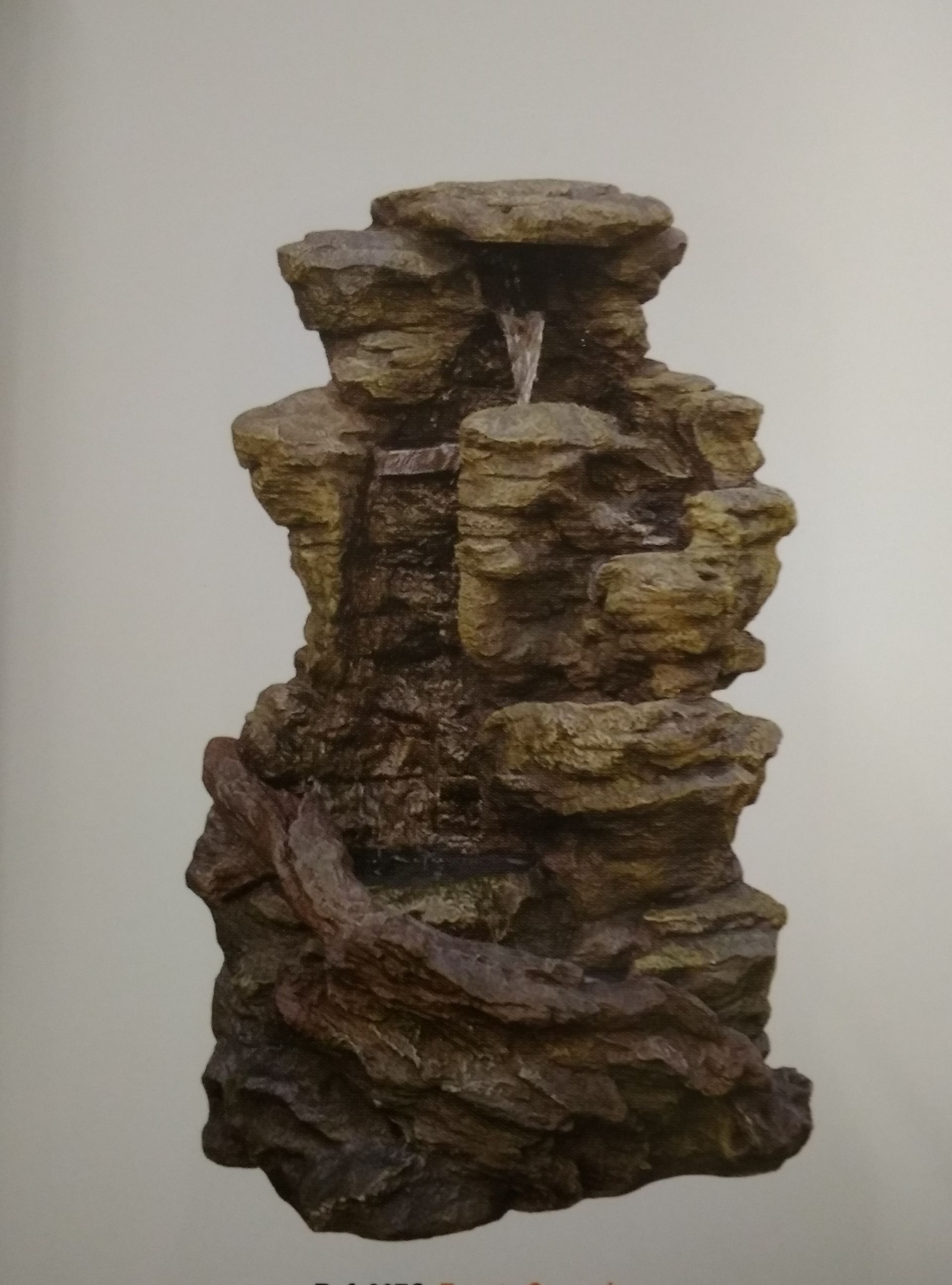 Fuente cascada rocas de 98 cm. de alto, fabricada en piedra artificial resistente a los elementos climáticos, con acabado pintado imitando el color natural. Para decoración de jardín, terraza o interior. Se suministra con bomba.