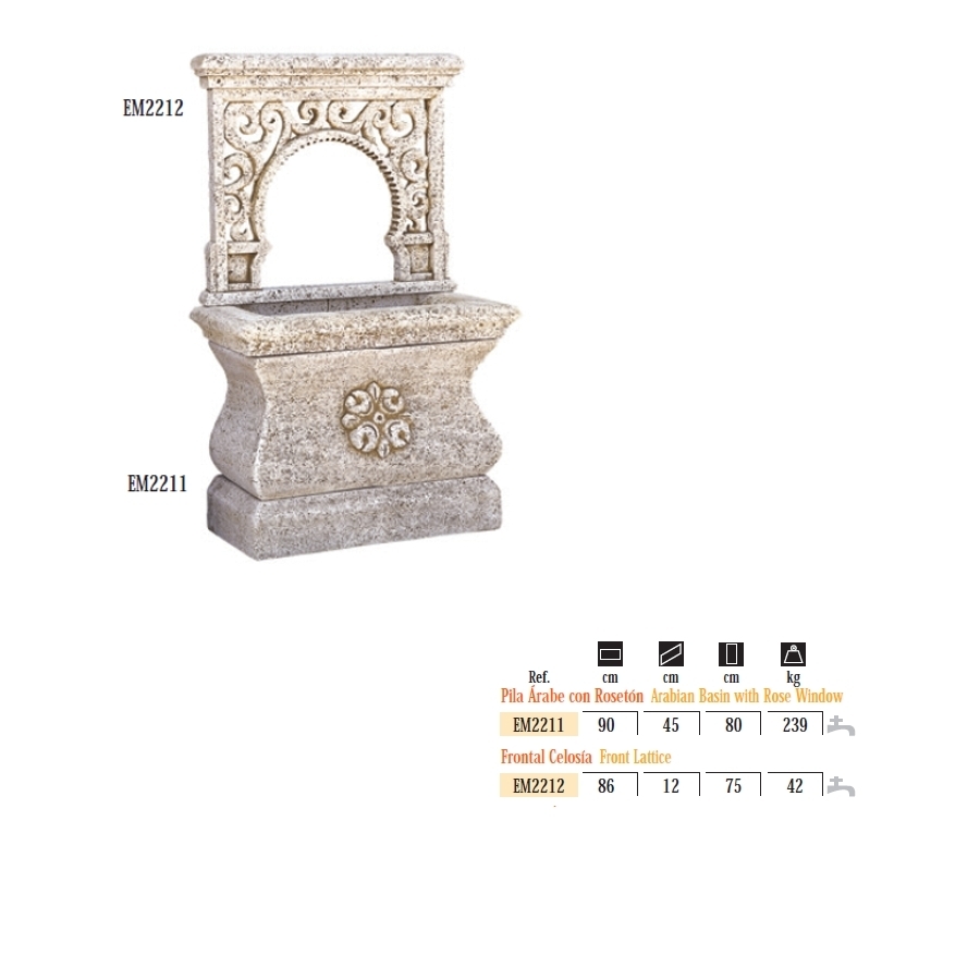 Decorativa fuente de pared de estilo árabe con celosia, fabricada en piedra artificial resistente a los elementos climáticos, disponible con acabado en pátina ocre, negra y verdoso.