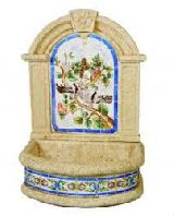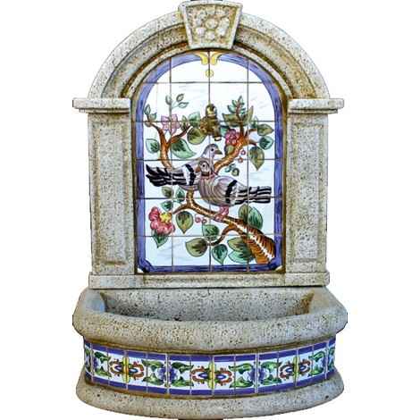 Fuente pared con grifo modelo Palomas, fabricada en piedra artificial con mural de azulejos con palomas pintadas, disponible en acabado en pátina ocre y ceniza. Para conectar al agua corriente.