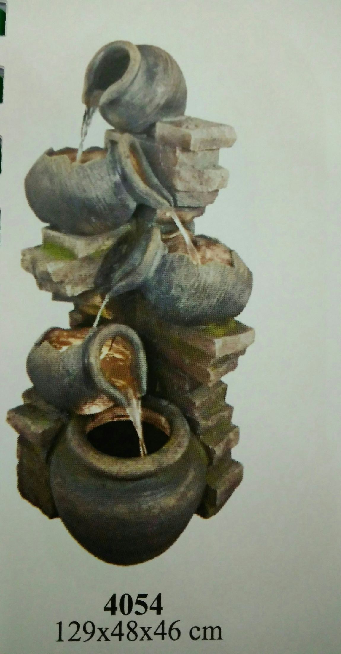 Decorativa fuente poliresina cascada cantaros con luces led en cada cantaro ilumina la caida del agua y causa un gran efecto. Se suministra con bomba y luces led. Apta para interior y exterior.
