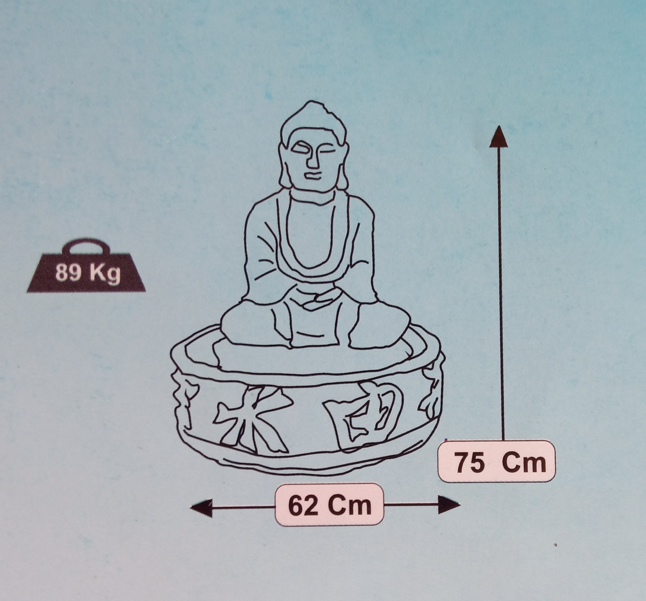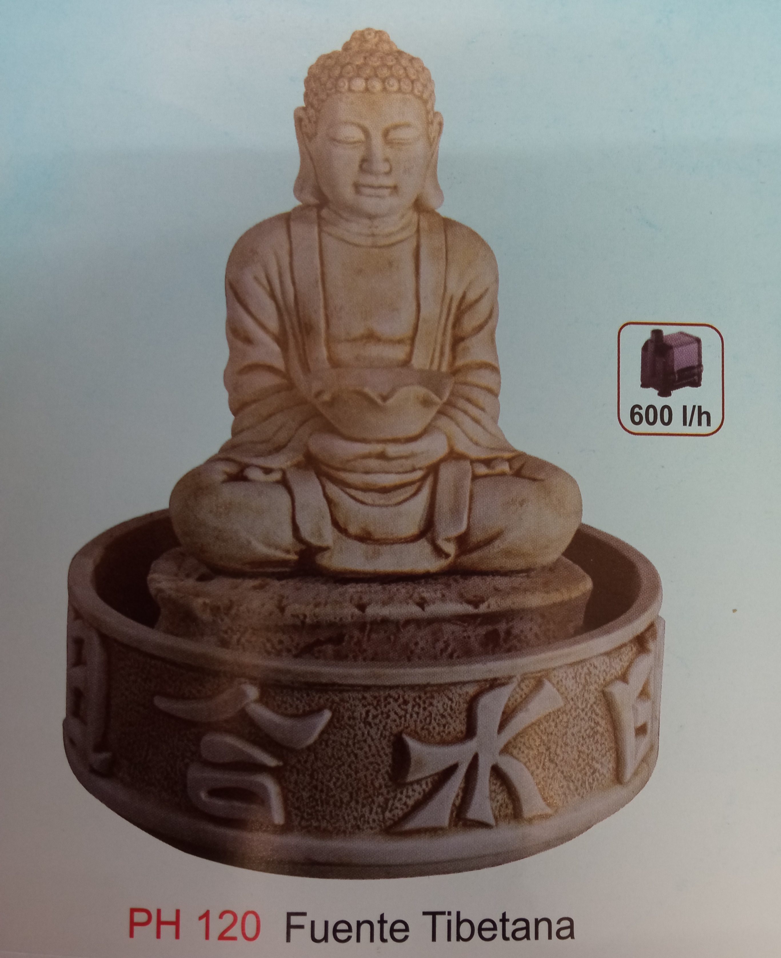 Decorativa fuente de estilo oriental modelo tibetana con buda, fabricada en piedra artificial resistente a los elementos climáticos con acabado en pátina ceniza (gris verdoso). Se suministra con bomba, cable electrico 1.5 m. Fácil montaje.