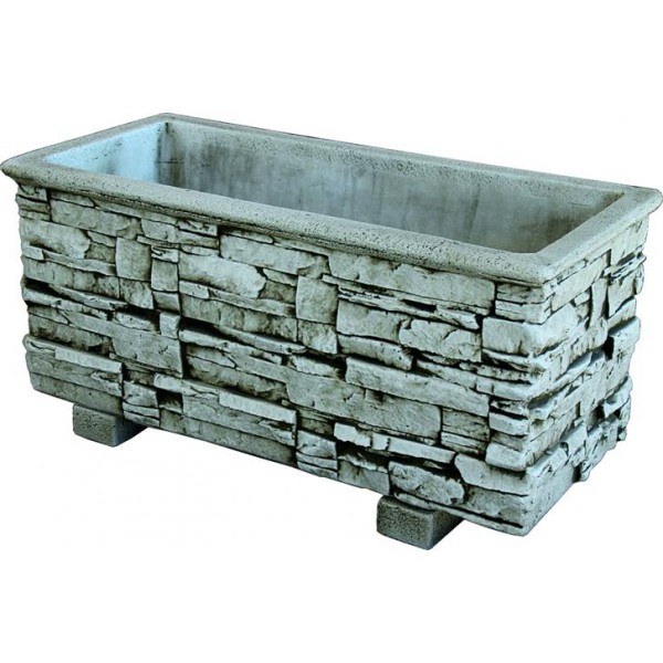 Decorativa jardinera de jardín modelo lajas fabricada en piedra artificial resistente a la intemperie, disponible con acabado en pátina ceniza, ocre y siena.