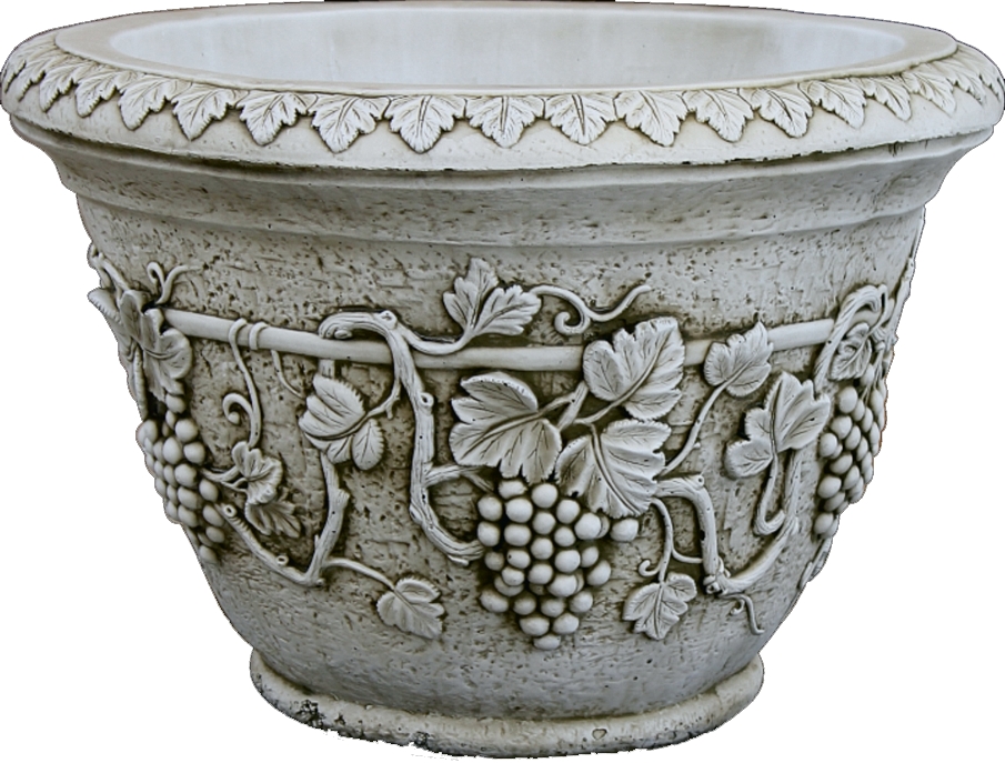 Decorativo macetero modelo Uvas fabricado en piedra artificial resistente a la intemperie, disponible con acabado en pátina ceniza, ocre y siena.