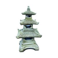 Pagoda decorativa con tres alturas, fabricada en piedra artificial, resistente a los elementos climáticos, con acabado en pátina, ceniza, ocre y siena. Se suministra en cuatro piezas, muy fácil de montar.