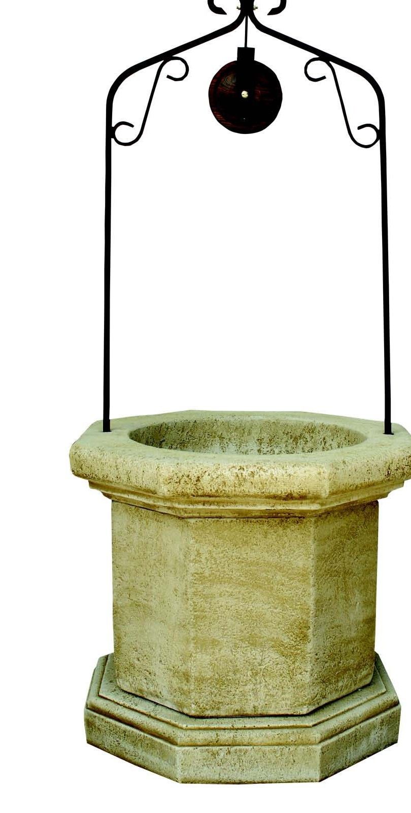 Decorativo brocal de poco de estilo natural fabricado en piedra artificial resistente a los elementos climáticos. Disconible con acabado en color marrón claro y gris. Se suministra con arco de hierro y polea.