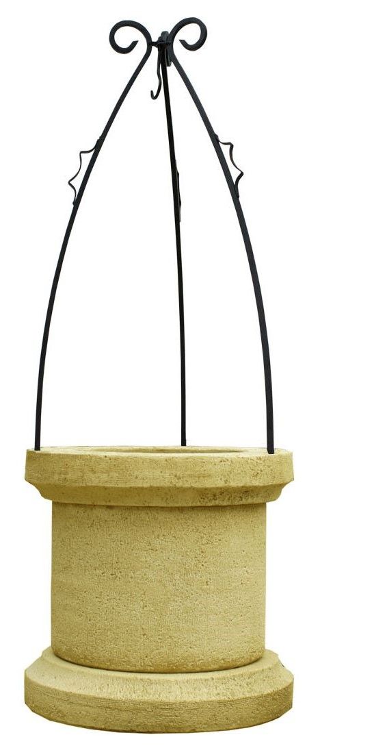 Decorativo brocal de pozo de estilo natural fabricado en piedra artificial resistente a los elementos climáticos. Disponible con acabado en color marrón claro. Se suministra con hierro.